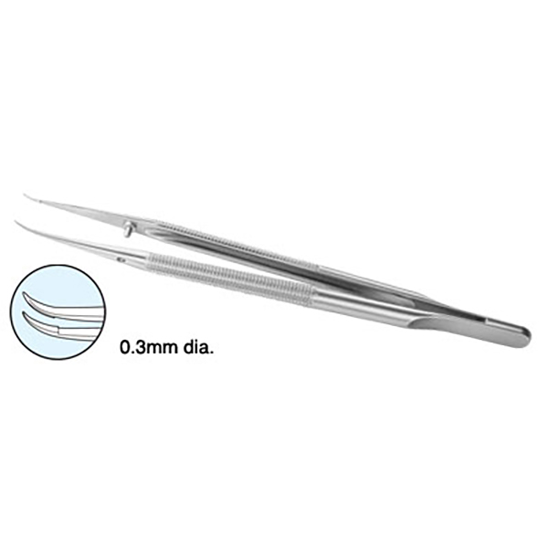Forceps 15cm Long, Round Handle 8mm diameter, Curved Tip 0.3mm diameter with tying platform