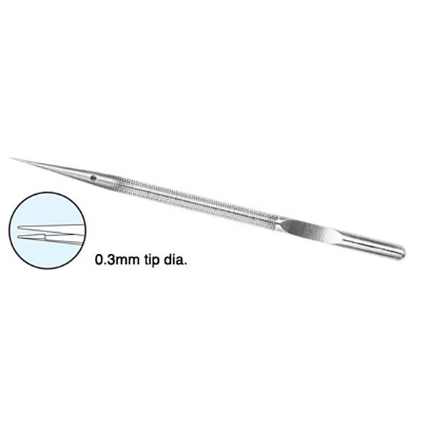Satellight Forceps, 15cm long, Round Handle 8mm diameter, counter balanced, Straight Tip 0.3mm diameter