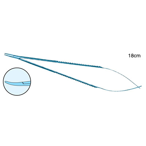 Jacobson Micro Needle Holder (Titanium) 18cm long, without Lock, Flat Handle Smooth Curved Jaw, 0.8mm Tip diameter