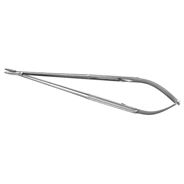 Needle Holder 21cm long, Round Handle 8mm diameter, Curved Tip 1.8mm diameter Tungsten Carbide Jaw, without Lock