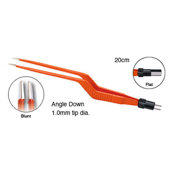 Bayonet Bipolar Forceps Non Stick, Flat Plug 20cm, Angled Down blunt tip, 1.0mm tip diameter